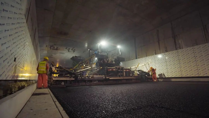 徐工成套高端油面設備,憑借引領行業的產品技術實力,為媽灣跨海通道的道路建設提供了成套化的高效施工解決方案,確保隧道路面施工作業圓滿實施。