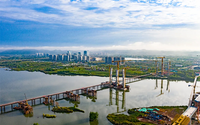 涪江六橋是遂寧首座斜拉橋,主橋為雙塔斜拉橋,項目總投資約19億元,路線全長3215千米,主墩最高118米,是全國首座無筋鋼殼混凝土組合柔性索塔。項目計劃于2025年10月建成,建成后將成為遂寧的標志性建筑,現已進入橋梁主墩索塔施工階段。