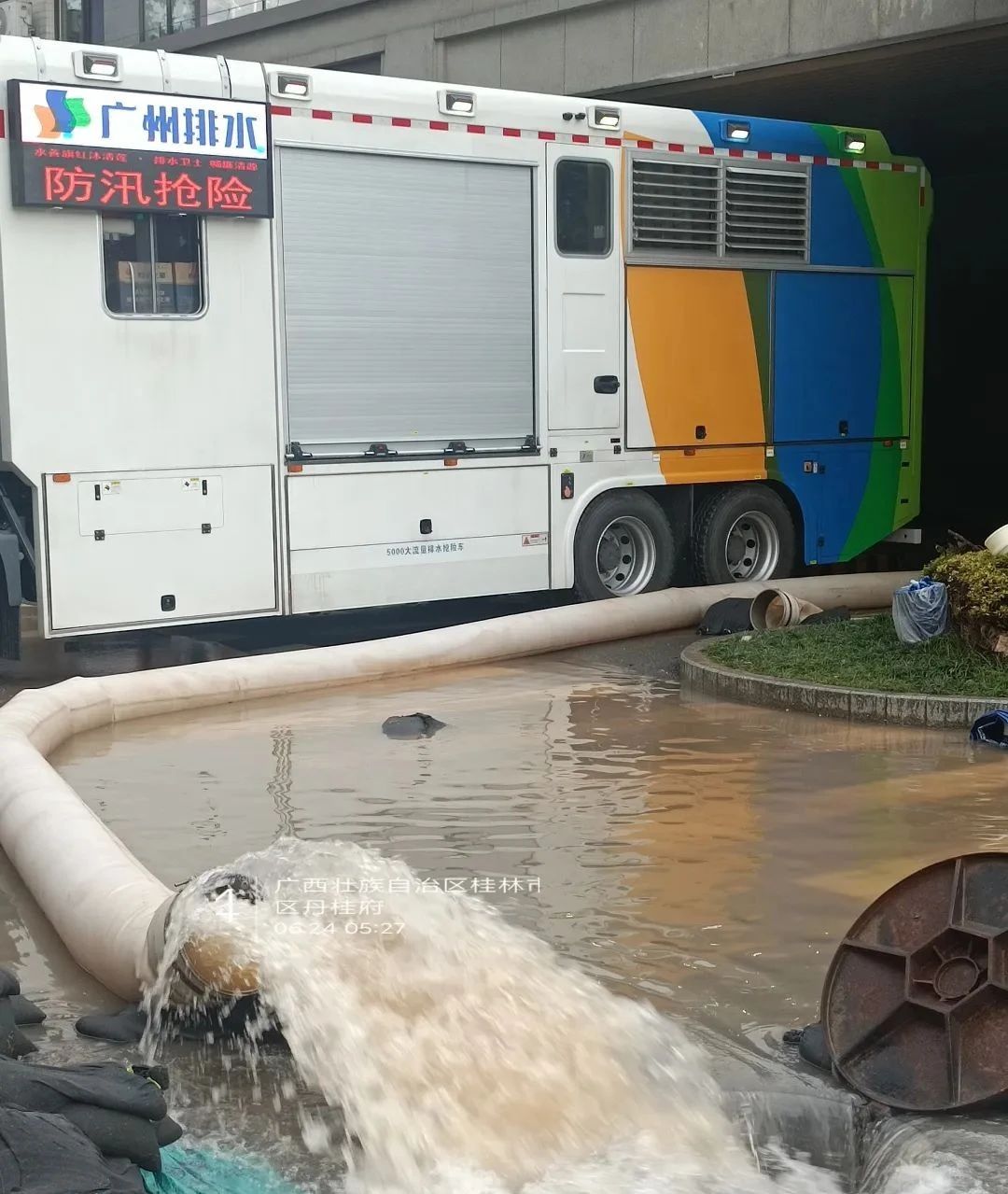 位于桂林七星區的丹桂府小區,地下車庫占地面積超50000m3,高度約3.5m,也同樣遭受到洪水的侵襲。來自廣州排水的徐工PS50B泵組式大流量排水搶險車迅速趕來,進行定點強排作業。十余小時加大馬力連續抽排積水。順利完成任務后,該臺設備又迅速趕往下一救援場地。