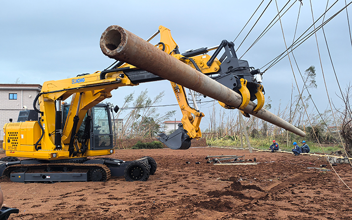 徐工開挖立桿一體機(jī)產(chǎn)品一車多能,平均每次新立電桿作業(yè)僅耗時(shí)20分鐘,是砼桿組立施工作業(yè)的革新式產(chǎn)品。相較傳統(tǒng)作業(yè)人力、吊機(jī)與挖機(jī)配合的方式,更具通用性、高效率和安全性,為本次臺(tái)風(fēng)搶險(xiǎn)救援行動(dòng)節(jié)省了大量的人力和時(shí)間成本,獲得施工方的高度認(rèn)可。