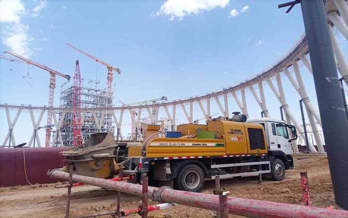 項目亮點之一的間冷塔,采用了創新的鋼管混凝土X柱結構,單柱高達30米,重達51.9噸。然而,隨著泵送高度的攀升,混凝土黏度急劇增加,泵送過程中極易出現憋壓熄火現象,對施工設備提出了前所未有的要求。