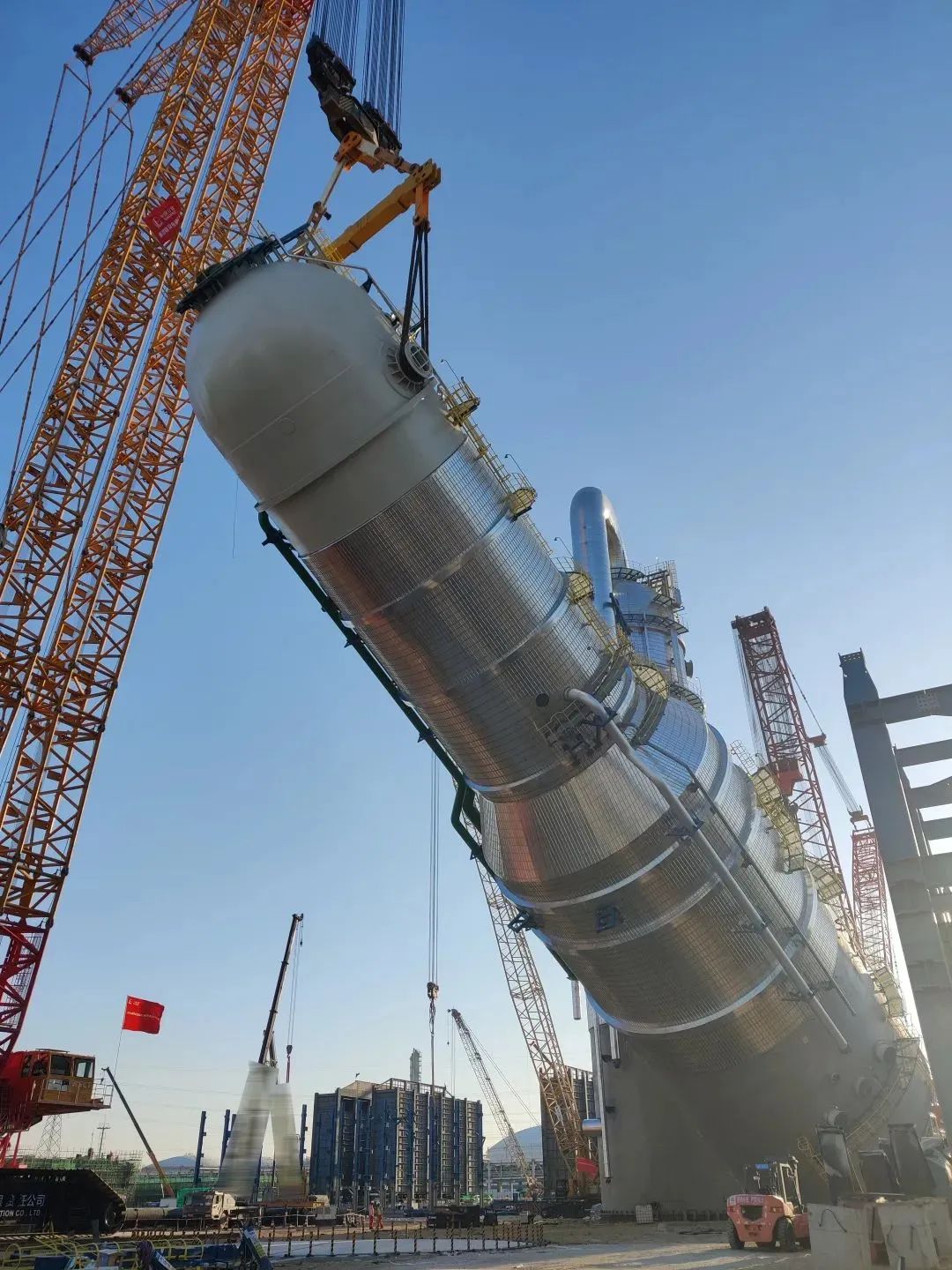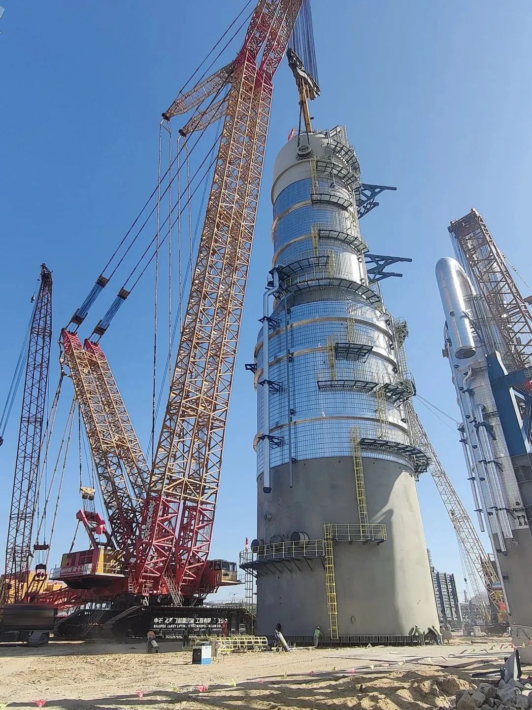 施工現(xiàn)場,XGC88000和XLC17000將“穿衣戴帽”后,總重量達2000噸的急冷水塔設備平穩(wěn)吊起并準確放置到預定位置,全程行云流水、一氣呵成,僅僅耗時三小時。
