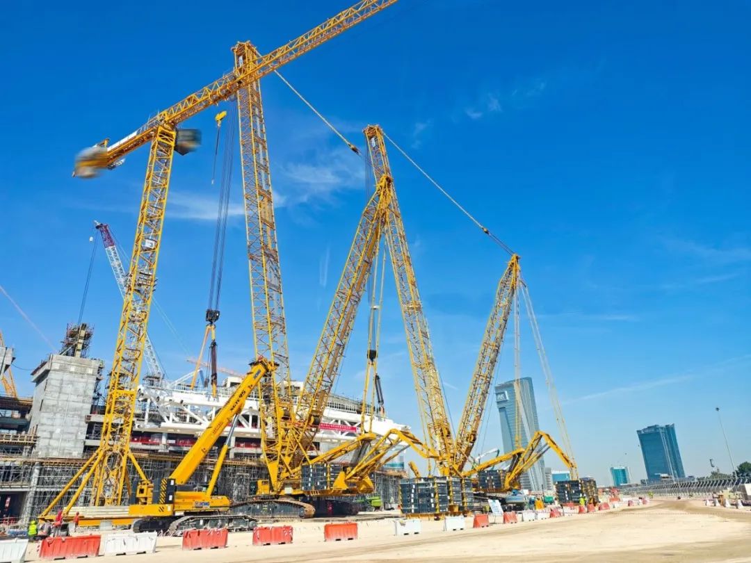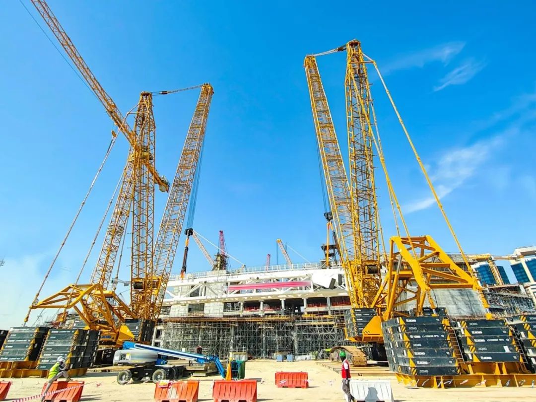 萬里之外的中東沙漠,2034年世界杯主場(chǎng)館建設(shè)現(xiàn)場(chǎng),XGC15000A與XGC12000領(lǐng)銜組成"鋼鐵艦隊(duì)"。