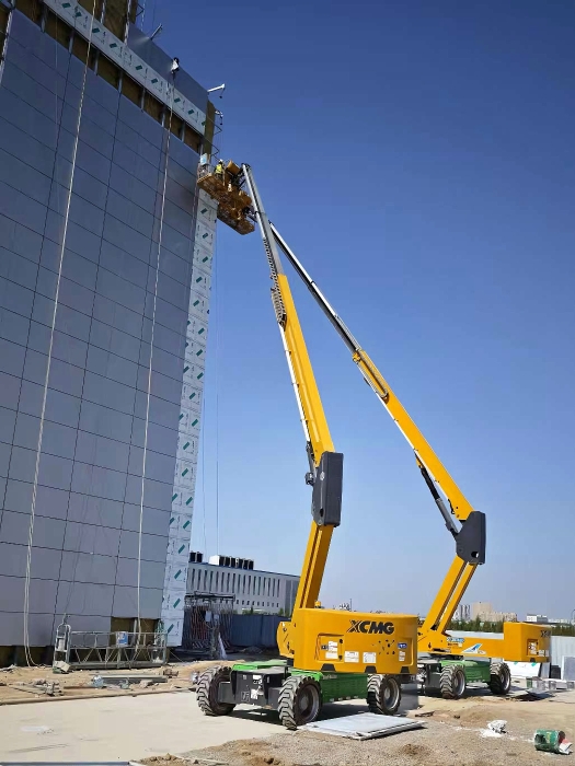 面對高空作業(yè)精度要求高、場地空間受限等挑戰(zhàn),項目引入2臺徐工XGS28ACK-Li純電直臂式高空作業(yè)平臺,以28.8米作業(yè)高度、22米超長幅度及300/460kg雙載荷模式,精準(zhǔn)覆蓋倉庫外墻面板安裝與收口工序。設(shè)備搭載的大容量鋰電池組支持連續(xù)8小時連續(xù)作業(yè),徹底規(guī)避傳統(tǒng)燃油設(shè)備尾氣污染,契合智慧物流中心對施工潔凈度的嚴(yán)苛要求,其智能化控制系統(tǒng)實現(xiàn)毫米級微動調(diào)節(jié),工人在高空平穩(wěn)操控大型墻面板,確保每塊板材嚴(yán)絲合縫。