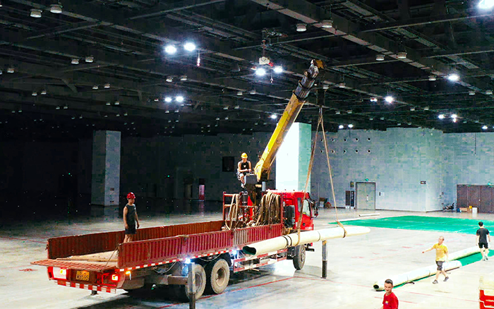 施工中,徐工隨車起重機憑借高強度鋼材打造的起重臂,展現(xiàn)出驚人的起重能力。吊運成卷塑膠卷材時,它動作流暢,如行云流水般將材料從貨箱卸下,穩(wěn)穩(wěn)送至場館指定鋪設(shè)位置。面對數(shù)噸重的特殊塑膠材料吊運難題,其四節(jié)臂體同步伸縮,輕松完成任務(wù)?!斑@設(shè)備的帶載能力遠超預(yù)期,再重、再難的吊運都不在話下!” 現(xiàn)場項目負(fù)責(zé)人對徐工隨車起重機的強大性能給予高度評價。