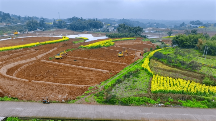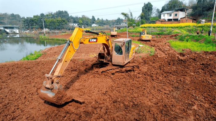 繼續向東,這里是萬里長江第一城——宜賓,在宜賓江安縣陽春鎮,5000畝高標準農田建設進入尾聲,項目高峰期投入30余臺徐工挖掘機